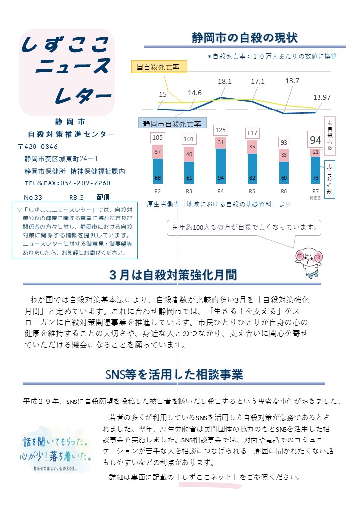 | 内容 | 自殺対策強化月間と静岡市自殺対策を周知するため、横断幕や懸垂幕を掲出しています。 |